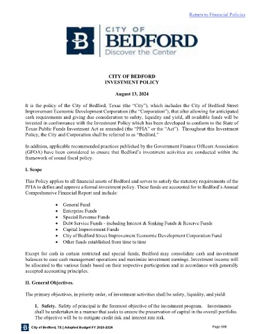 PFIA to define and approve a formal investment policy. These funds are accounted for in Bedford’s Annual