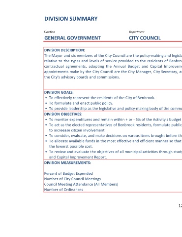 relative to the types and levels of service provided to the residents of Benbrook. These duties include: adopting ordinances, approving major purchases and
