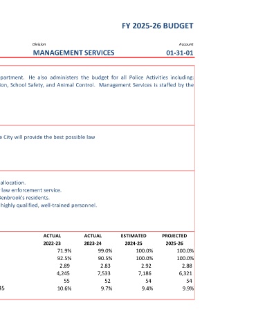 Communications/Records, Patrol, Criminal Investigation Section, Crime Prevention, School Safety, and Animal Control. Management Services is staffed by the
