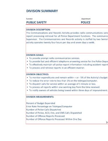 report processing retrieval for all Police Department functions. The communications and records activity is supervised by a Commander and a Police Services