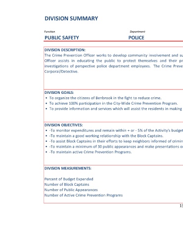 investigations of perspective police department employees. The Crime Prevention Officer is supervised by the Chief of Police. The activity is staffed by a