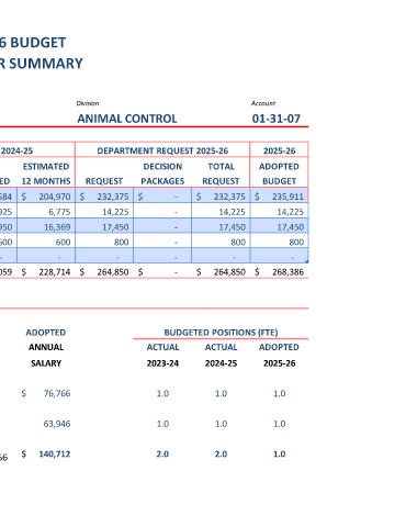 Senior Animal Control Officer 25 $4,774 to $6,397 $ 76,766 1.0 1.0 1.0