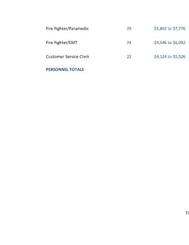 Fire Fighter/Paramedic 29 $5,802 to $7,776 1,551,948 14.0 14.0 18.0 Fire Fighter/EMT 24 $4,546 to $6,092 210,847 7.0 7.0 3.0 Customer Service Clerk 22 $4,124 to $5,526 66,314 1.0 1.0 1.0 PERSONNEL TOTALS $ 2,900,663 31.0 31.0 31.0 159