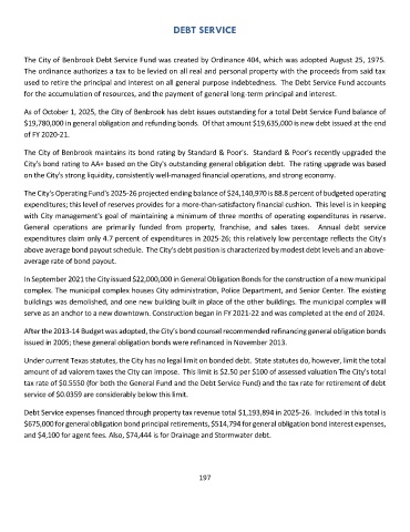 The City of Benbrook Debt Service Fund was created by Ordinance 404, which was adopted August 25, 1975.