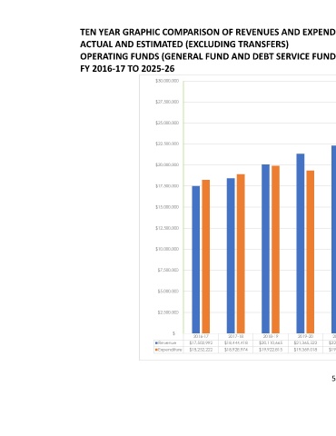 TEN YEAR GRAPHIC COMPARISON OF REVENUES AND EXPENDITURES ACTUAL AND ESTIMATED (EXCLUDING TRANSFERS) OPERATING FUNDS (GENERAL FUND AND DEBT SERVICE FUND) FY 2016-17 TO 2025-26 54