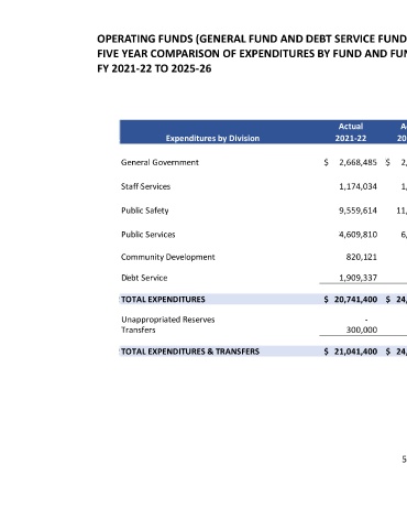 FIVE YEAR COMPARISON OF EXPENDITURES BY FUND AND FUNCTION