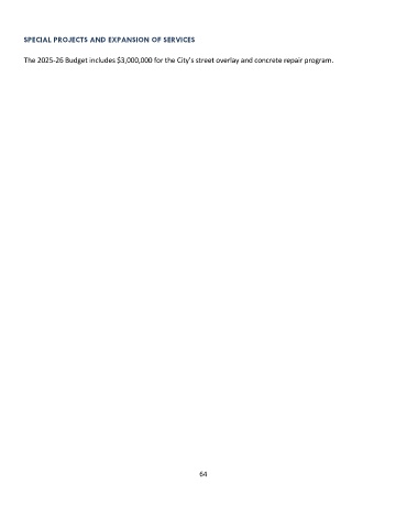SPECIAL PROJECTS AND EXPANSION OF SERVICES The 2025-26 Budget includes $3,000,000 for the City’s street overlay and concrete repair program. 64