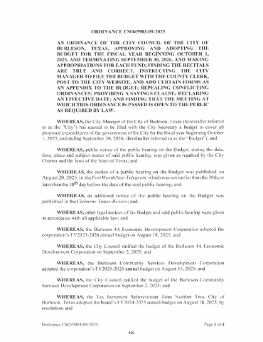 Burleson, Texas adopted the board's FY2024-2025 annual budget on August 18, 2025, by