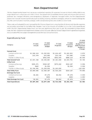 The Non-Depar tmental Depar tment ser ves as a centralized repository for expenses that are not directly attributable to any