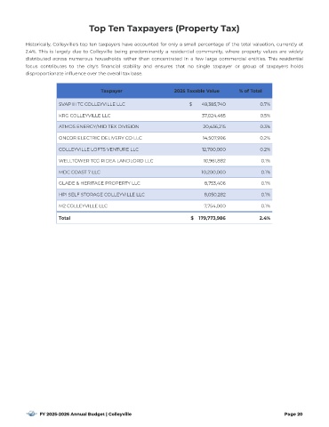 Historically, Colleyville's top ten taxpayers have accounted for only a small percentage of the total valuation, currently at