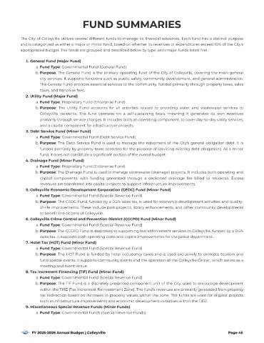 The City of Colleyville utilizes several different funds to manage its {nancial resources. Each fund has a distinct purpose