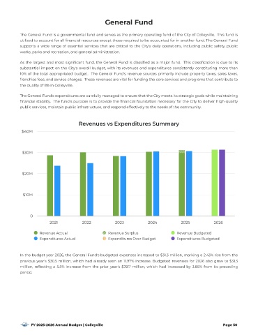 The General Fund is a governmental fund and ser ves as the primary operating fund of the City of Colleyville. This fund is