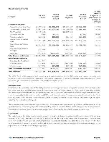 and sewer base rates and volumetric usage charges. For FY 2026 , the City increased the {xed monthly base rates for water