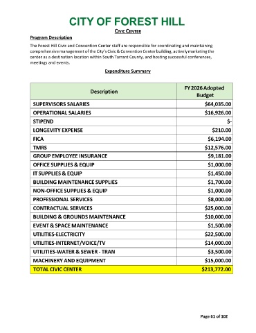 The Forest Hill Civic and Convention Center staff are responsible for coordinating and maintaining