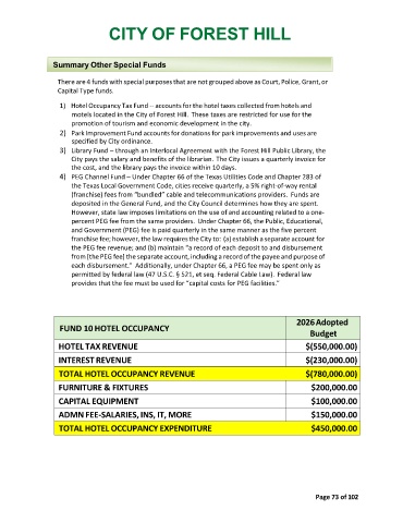 motels located in the City of Forest Hill. These taxes are restricted for use for the