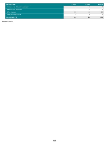 Position Name* FY2024 FY2025 FY2026 Environmental Outreach Coordinator 1 1 1 Administrative Supervisor 1 1 1 Office Assistant 0.5 0.5 0.5 Public Health Specialist 2 2 2 ALLOCATED FTE 32.5 30 31.5 Powered by OpenGov 168