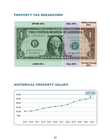 PROPERTY TAX BREAKDOWN Dallas County GPISD 48% City 29% 23% AISD 49% City 29% Tarrant County 22% HISTORICAL PROPERTY VALUES $26.5B $30B $25B $20B $15B $10B $5B 2015 2016 2017 2018 2019 2020 2021 2022 2023 2024 2025 2026 20