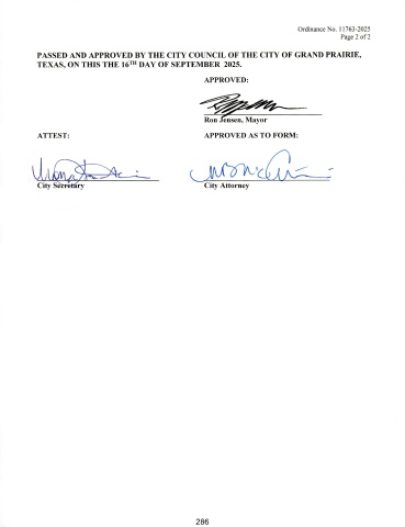 Ordinance No. 11763- 2025 Page 2 of 2 PASSED AND APPROVED BY THE CITY COUNCIL OF THE CITY OF GRAND PRAIRIE, TEXAS, ON THIS THE 16TH DAY OF SEPTEMBER 2025. APPROVED: Ko , ensen, Mayor ATTEST: APPROVED AS TO FORM: City Se ry City Attorney 286