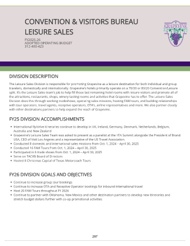 The Leisure Sales Division is responsible for promoting Grapevine as a leisure destination for both individual and group
