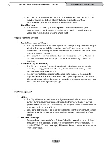 o Revenue bond coverage (Water & Sewer) shall be maintained at a minimum