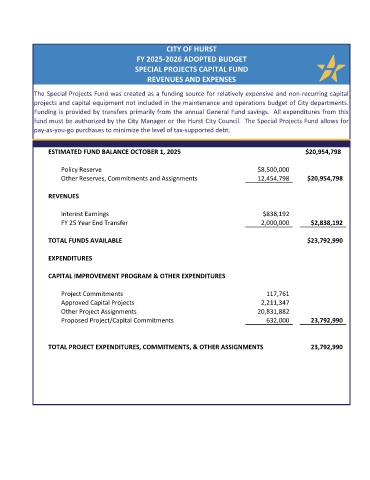 fund must be authorized by the City Manager or the Hurst City Council. The Special Projects Fund allows for
