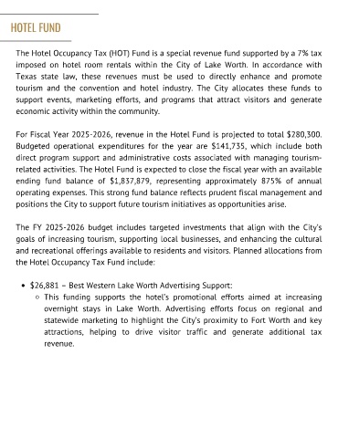 The Hotel Occupancy Tax (HOT) Fund is a special revenue fund supported by a 7% tax
