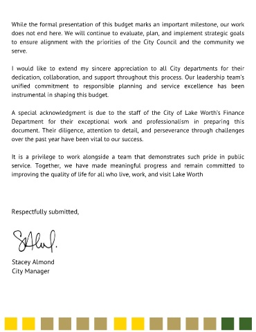 A special acknowledgment is due to the staff of the City of Lake Worth’s Finance
