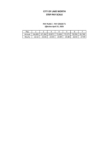 CITY OF LAKE WORTH STEP PAY SCALE PAY PLAN C - PAY GRADE F1 Effective April 21, 2025 Pay 1 2 3 4 5 6 7 Annual 64,600 67,184 69,871 72,666 75,573 78,596 81,740 Hourly 22.12 23.01 23.93 24.89 25.88 26.92 27.99