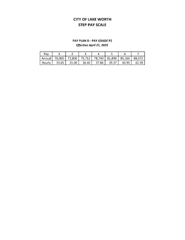 CITY OF LAKE WORTH STEP PAY SCALE PAY PLAN D - PAY GRADE P2 Effective April 21, 2025 Pay 1 2 3 4 5 6 7 Annual 70,000 72,800 75,712 78,740 81,890 85,166 88,572 Hourly 33.65 35.00 36.40 37.86 39.37 40.95 42.58