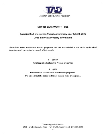 Appraisal Roll Information Valuation Summary as of July 23, 2025