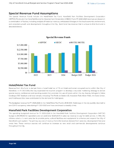 The Special Revenue Funds include the Hotel/Motel Tax Fund, Mansfield Park Facilities Development Corporation