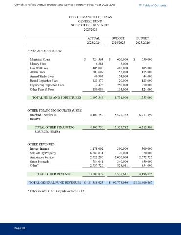 City of Mansfield Annual Budget and Service Program Fiscal Year 2025-2026 Table of Contents Page 106
