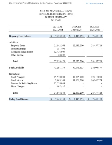 City of Mansfield Annual Budget and Service Program Fiscal Year 2025-2026 Table of Contents Page 111