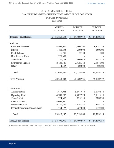 City of Mansfield Annual Budget and Service Program Fiscal Year 2025-2026 Table of Contents A $4M land purchase for future park development resulted in a fund balance decrease of 13% in FY 2023-2024. Page 120