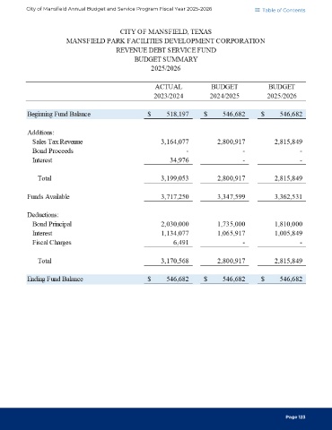 City of Mansfield Annual Budget and Service Program Fiscal Year 2025-2026 Table of Contents Page 123