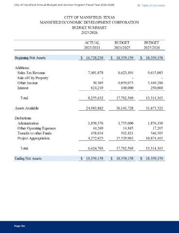 City of Mansfield Annual Budget and Service Program Fiscal Year 2025-2026 Table of Contents Page 124