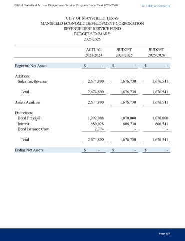 City of Mansfield Annual Budget and Service Program Fiscal Year 2025-2026 Table of Contents Page 127