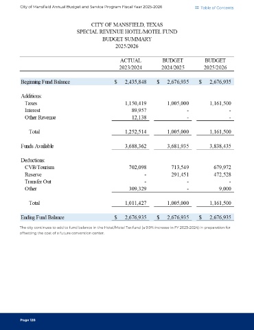 The city continues to add to fund balance in the Hotel/Motel Tax fund (a 9.9% increase in FY 2023-2024) in preparation for