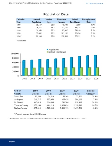 City of Mansfield Annual Budget and Service Program Fiscal Year 2025-2026 Table of Contents Population Data Demographic information based on the 2020 Census and the Mansfield Independent School District. Page 14
