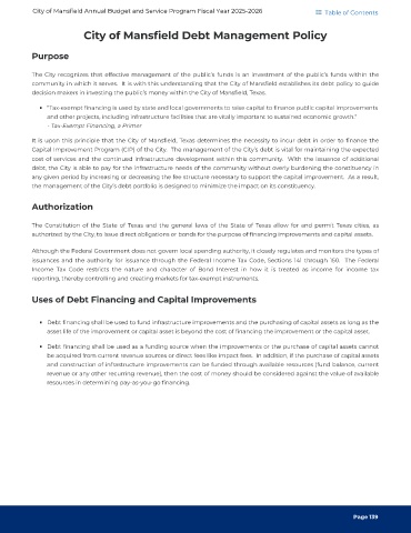 community in which it serves. It is with this understanding that the City of Mansfield establishes its debt policy to guide
