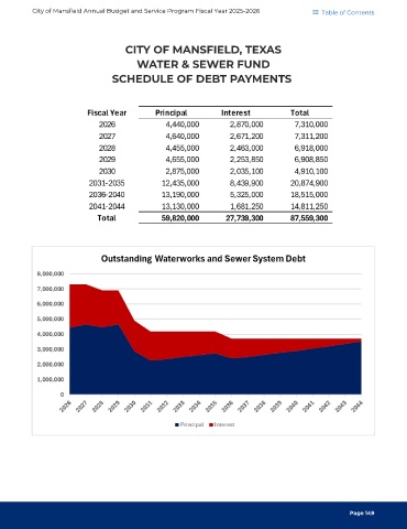 City of Mansfield Annual Budget and Service Program Fiscal Year 2025-2026 Table of Contents CITY OF MANSFIELD, TEXAS WATER & SEWER FUND SCHEDULE OF DEBT PAYMENTS Page 149