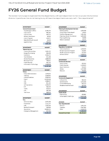 The General Fund budget is organized into nine departments, with each department further structured into functional