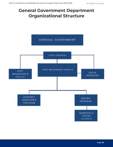 City of Mansfield Annual Budget and Service Program Fiscal Year 2025-2026 Table of Contents General Government Department Organizational Structure Page 155