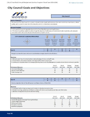 City of Mansfield Annual Budget and Service Program Fiscal Year 2025-2026 Table of Contents City Council Goals and Objectives Page 162