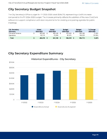 City Secretary Expenditure Summary