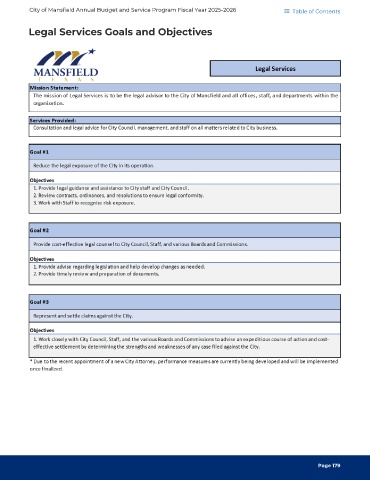 City of Mansfield Annual Budget and Service Program Fiscal Year 2025-2026 Table of Contents Legal Services Goals and Objectives Page 179