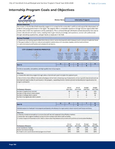City of Mansfield Annual Budget and Service Program Fiscal Year 2025-2026 Table of Contents Internship Program Goals and Objectives Page 190