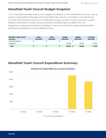 The FY 2025-2026 Mansfield Youth Council budget totals $36,930, a 17.93% decrease from the prior year as