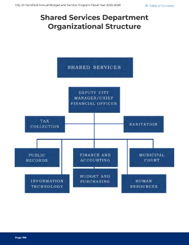 City of Mansfield Annual Budget and Service Program Fiscal Year 2025-2026 Table of Contents Shared Services Department Organizational Structure Page 196