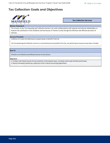 City of Mansfield Annual Budget and Service Program Fiscal Year 2025-2026 Table of Contents Tax Collection Goals and Objectives Page 242